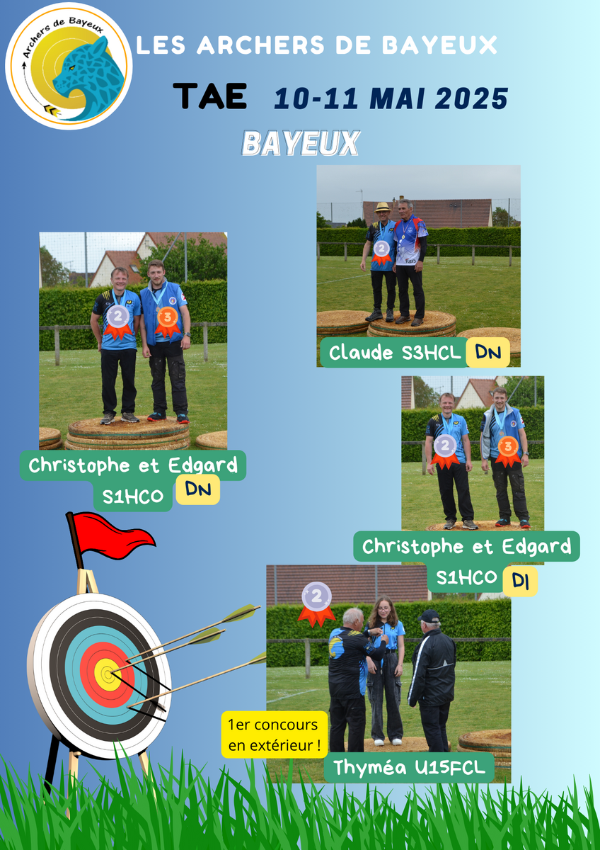 Pour notre concours, 14 archers ont participé : pas facile de jongler entre l'organisation et les tirs. Néanmoins, Christophe et Edgard ont eu chacun respectivement 2 médailles d'argent et 2 médailles de bronze, en distances nationales et internationales. Claude se classe 2ème dans sa catégorie des S3 CL en distance nationale.