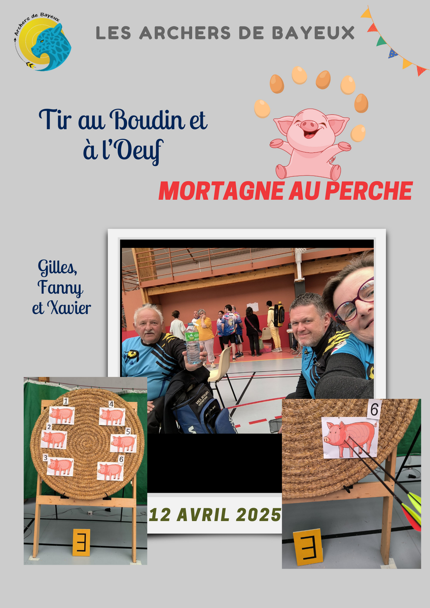 C'est un rendez-vous que nos archers affectionnent particulièrement : le tir au boudin et à l'oeuf organisé par les archers de Mortagne au Perche. Cette année, ils ne sont que 3 à avoir pu y aller : Xavier, Fanny et Gilles ont rapporté 153 cm de boudin et 16 oeufs ( contre 125 cm et 17 oeufs l'an dernier à 4 ! ) On voit que la technique se peaufine ! Bravo et merci aux archers de Mortagne pour ce bel évènement dans la capitale du boudin noir !