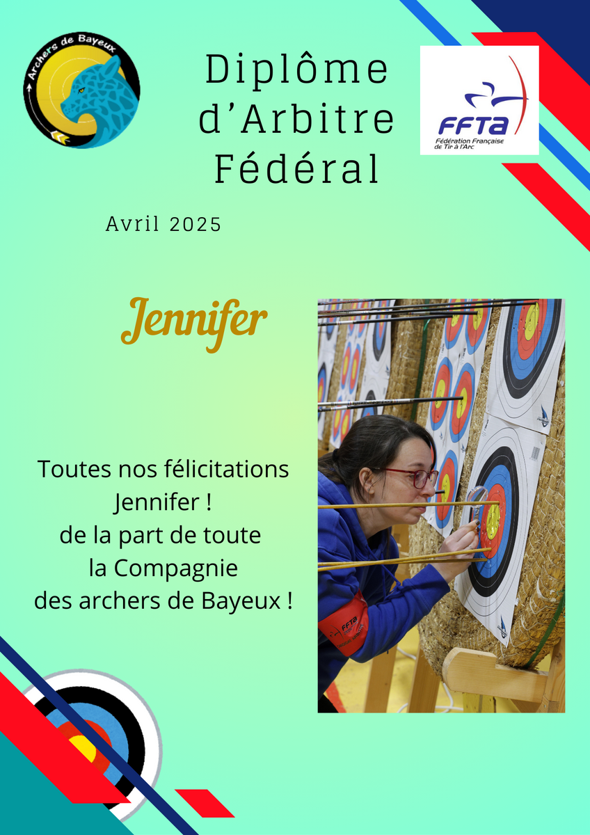 * Jennifer a obtenu son diplôme d'arbitre : merci Jennifer pour ton dévouement et ce travail de longue haleine ! C'est du bon travail et nous saluons l'investissement personnel de notre archère-désormais Arbitre !