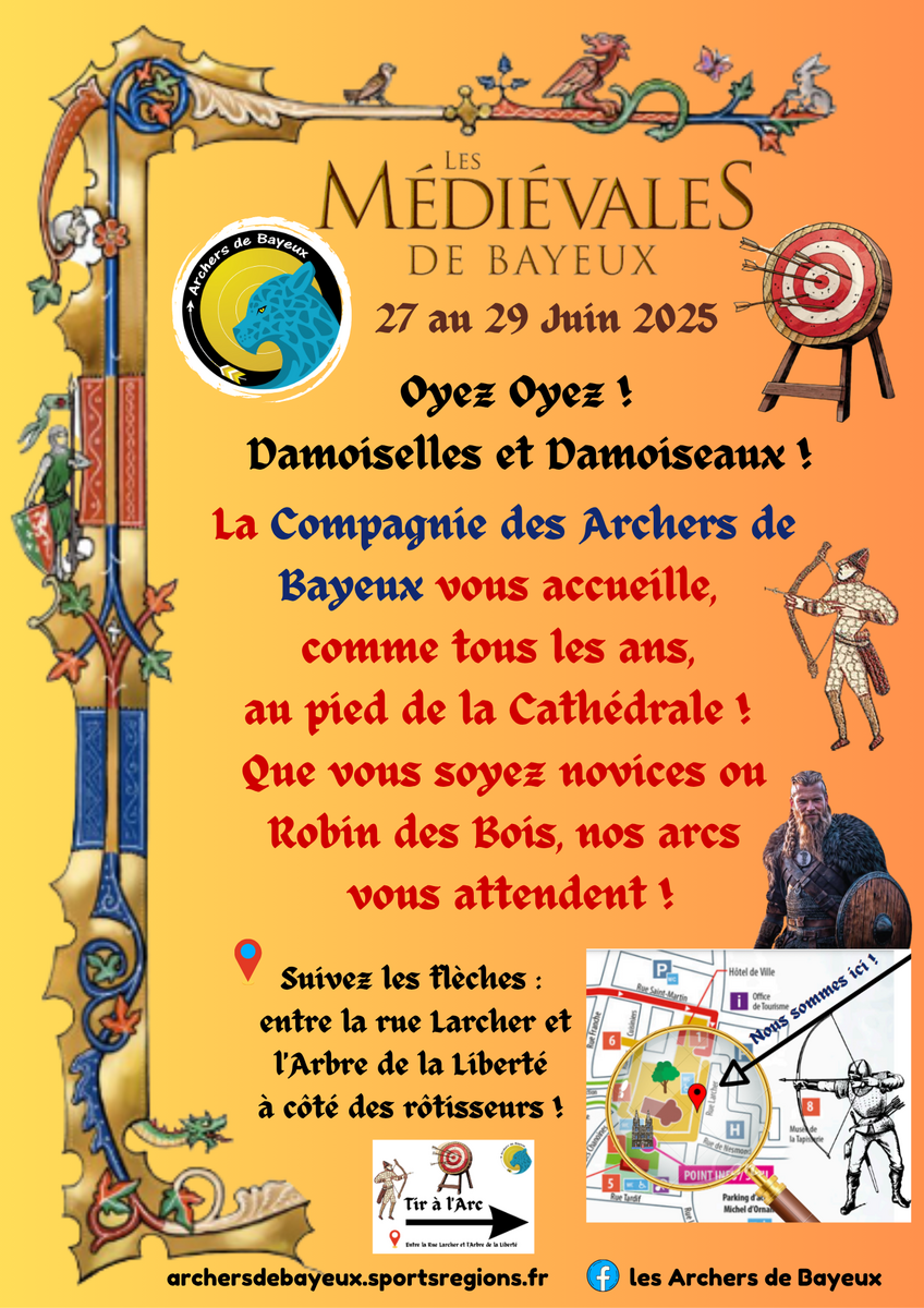 Oyez, Oyez, Gentes Dames et Damoiseaux ! La Compagnie des Archers de Bayeux sera de nouveau présente à la 38ème édition des Médiévales de Bayeux. Celles-ci se dérouleront du 27 au 29 juin 2025 🏹Nous vous accueillerons avec nos arcs et nos cibles, aux pieds de la cathédrale ! Venez nombreux nous rendre visite 😃 Suivez les flèches !